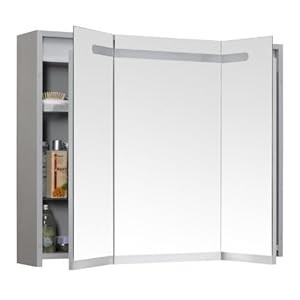 - Allibert Spiegelschrank Sopran'o mit großem Stauraum, einem modernem Holzkorpus in eleganter Aluminiumoptik und mit drei Spiegeltüren ausgestattet. Der Spiegelschrank besitzt zudem sechs individuell einpassbare Einlegeböden aus Glas und eine indirekte Beleuchtung an der Oberseite. Außerdem ist eine Steckdose mit Schalter im Mittelteil des Schrankes integriert.